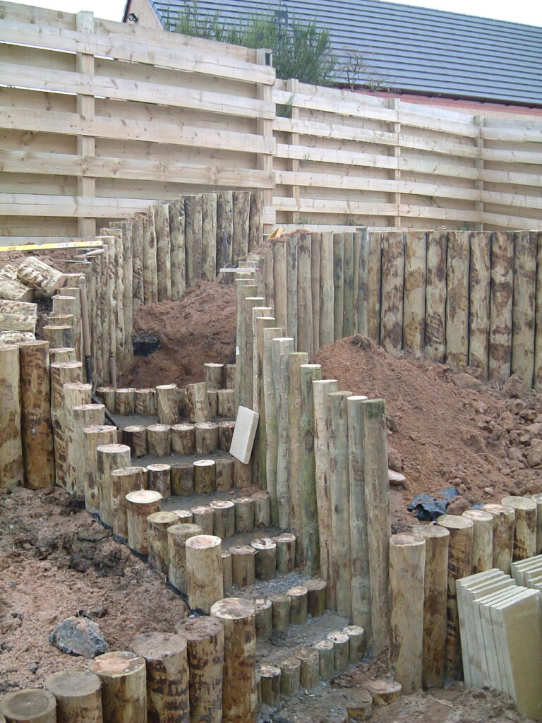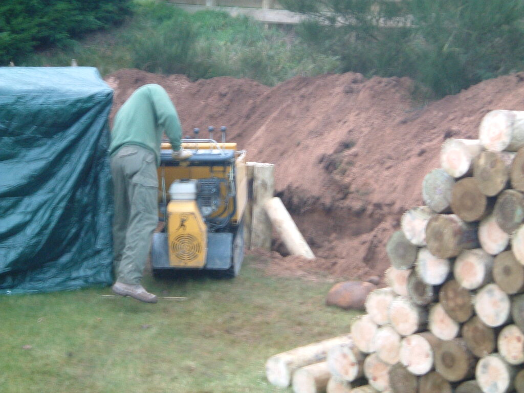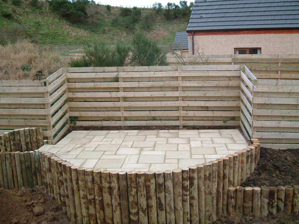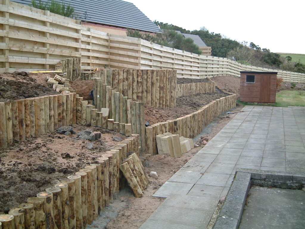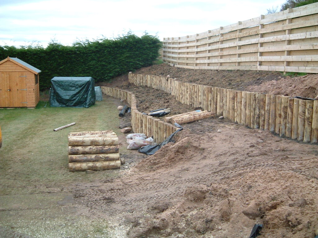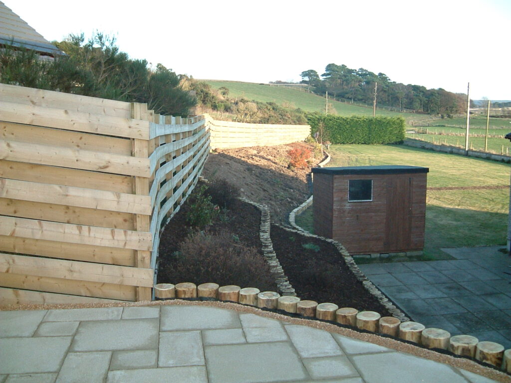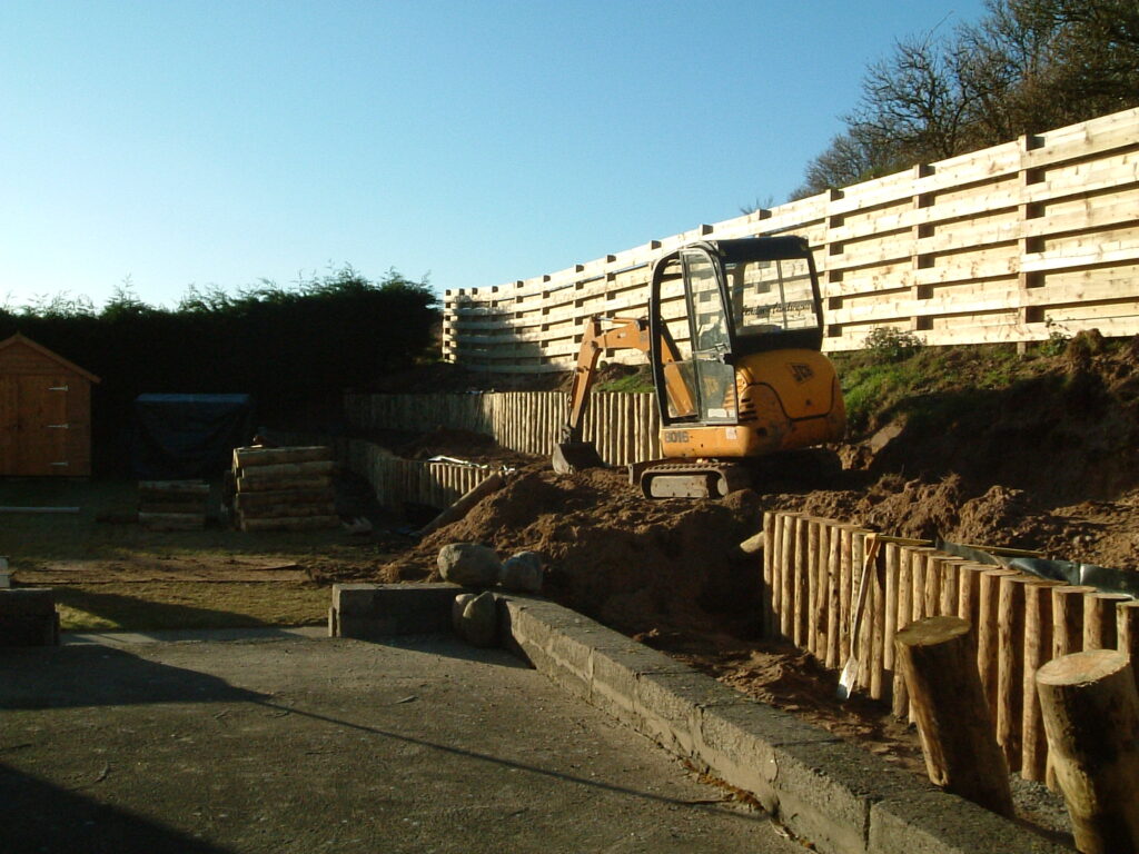In 2004 we decided that the banking needed landscaping rather than being left to grass and gorse bushes. So a design to terrace the area with planting areas and a raised patio was put in place.